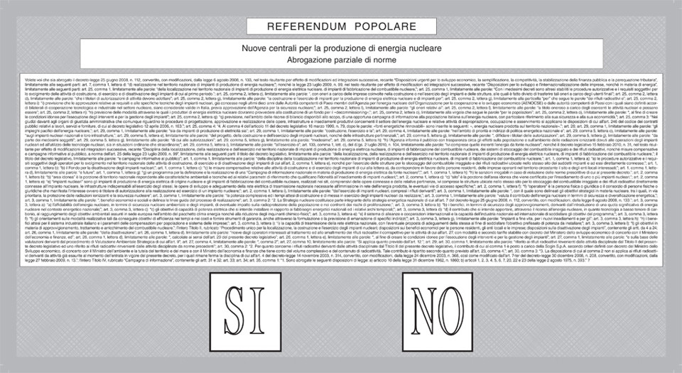 Il decreto legge n. 1234/abc del 01/01/1950 che non abroga la legge 5678xyz del 01/01/2000 ma estende la legge costituzionale 6666/zzz del 31/12/2005 comma 3, riga 2, carattere 5 e dice che in pratica non si possono non costruire centrali non nucleari nelle zone i cui territori non siano non stati non indicati come zona non nuclearizzata, salvo le zone in cui la non nuclearizzazione non si sovrappone alla legge 111/ppp del 05/12/1981 (ma francamente quel giorno i politici si erano fatti di bamba), e in piu` nella divina commedia, Dante dice a Virgilio: “In quel girone non andare, dici no alla centrale nucleare”, e insomma questa legge potrebbe non essere non approvata dipende dal non voto di questo referendum. Non siete non in disaccordo con questo? [SI] [NO]